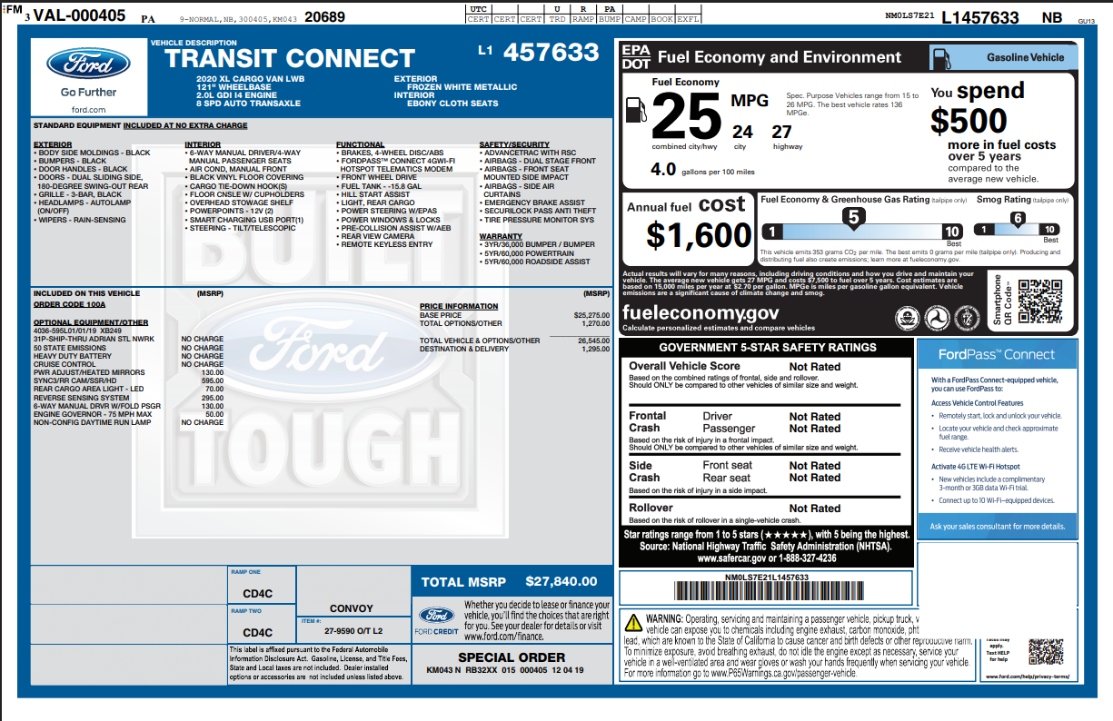 FORD TRANSIT CONNECT XL w/Rear Swing-Out Doors 120.6" WB